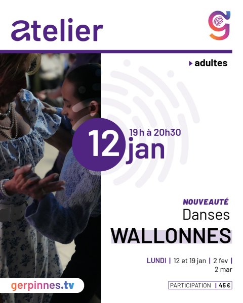 Envie de bouger au rythme de nos traditions ? Rejoignez-nous pour découvrir les pas, les musiques et la convivialité des danses wallonnes dans une ambiance festive et accessible à tous. Un atelier animé par Marinette Bonnert. En plus des 4 ateliers danse, vous assisterez à une conférence sur les musiques wallonnes présentée par le projet Melchior le 5 février.