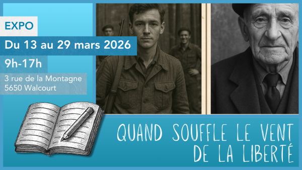 Le journal de Justin, jeune résistant en terre wallonne. À travers les yeux de Justin Dupuis, un adolescent de 15 ans originaire de Beaumont, l’exposition entraîne les visiteurs dans un voyage immersif au coeur de la Résistance belge durant la Seconde Guerre mondiale. Venez découvrir les enjeux de l’occupation, les formes de résistance, les risques encourus et les valeurs portées par ceux qui ont dit non. L’accent est mis sur les événements locaux du Sud Hainaut et du Sud Namurois, souvent méconnus mais riches en récits héroïques. Réalisée par le groupe «Passeurs de liberté en Sud-Hainaut».